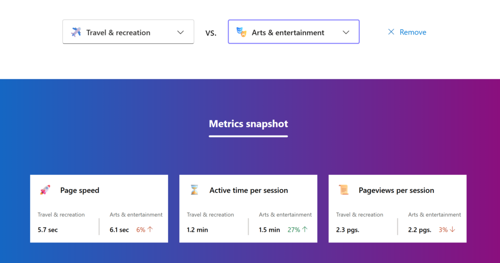 In the arts and entertainment genres the site load speed is slower than travel and recreation. Also, it gives very good benchmark metrics like average time per session and pageviews per session.