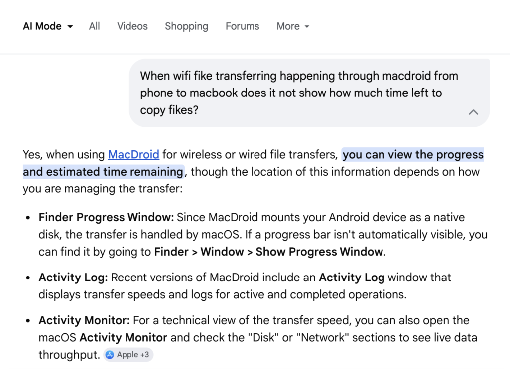 If your files are small, this may not be that bothersome, but, if your file is big, you would start getting into panic attacks. Like I was having, when I wanted to transfer files which were above 5GB. The macbook only has USB C connections, so I had to use Macdroid with WiFi. Yet, not having to see the time remaining/progress was a bit unnerving for me.